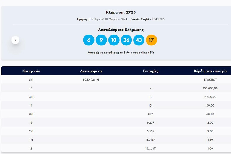 Οι τυχεροί αριθμοί: 6, 9, 10, 36, 43. TZΟΚΕΡ: 17.