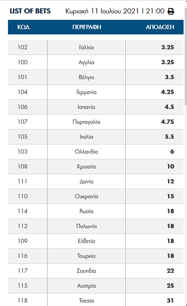 Η Γαλλία και η Αγγλία δίνονται από τον ΟΠΑΠ ως φαβορί για την κατάκτηση του Euro 2020. Οι δύο ομάδες παίζονται σε αποδόσεις 3,25, ενώ ακολουθούν το Βέλγιο, η Γερμανία και η Ισπανία.
