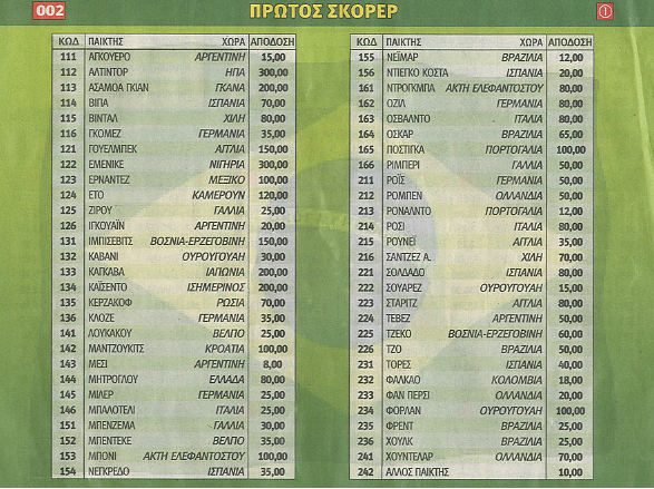 Ο ΟΠΑΠ έδωσε τα ποσοστά για τον πρώτο σκόρερ της διοργάνωσης, με τον «γκολεαδόρ» της Αργεντινής Λιονέλ Μέσι να έχει απόδοση 8 και τους Νεϊμάρ και Ρονάλντο να δίνονται ως δεύτερα φαβορί με απόδοση 12.