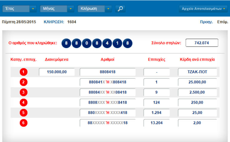 Ουδείς εκ των επίδοξων εκατομμυριούχων δεν κατάφερε να προβλέψει τους έξι χρυσούς αριθμούς που ανέδειξε η κληρωτίδα, ωστόσο 12 διαγωνιζόμενοι μάντεψαν σωστά τους πέντε εξ αυτών, με αποτέλεσμα να γίνουν πλουσιότεροι κατά 64.000 ευρώ έκαστος.