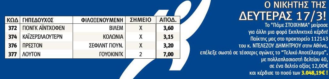 Tην τύχη με το μέρος του είχε ένας παίκτης του «Πάμε ΣΤΟΙΧΗΜΑ» την περασμένη Δευτέρα, καθώς κατάφερε με γκολ στις καθυστερήσεις να πάρει το ποσό των 3.048.19 ευρώ.