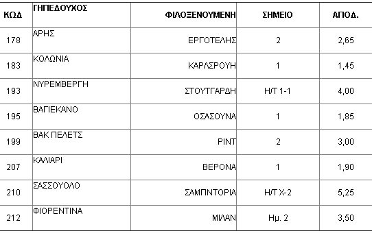 Το Χ/2 στον αγώνα Σασουόλο-Σαμπντόρια πλήρωσε 5,25 και το 1/1 στο παιχνίδι Νυρεμβέργη-Στουτγάρδη 4,00. Το διπλό της Μίλαν στο πρώτο ημίχρονο του αγώνα της με την Φιορεντίνα έδωσε απόδοση 3,50.