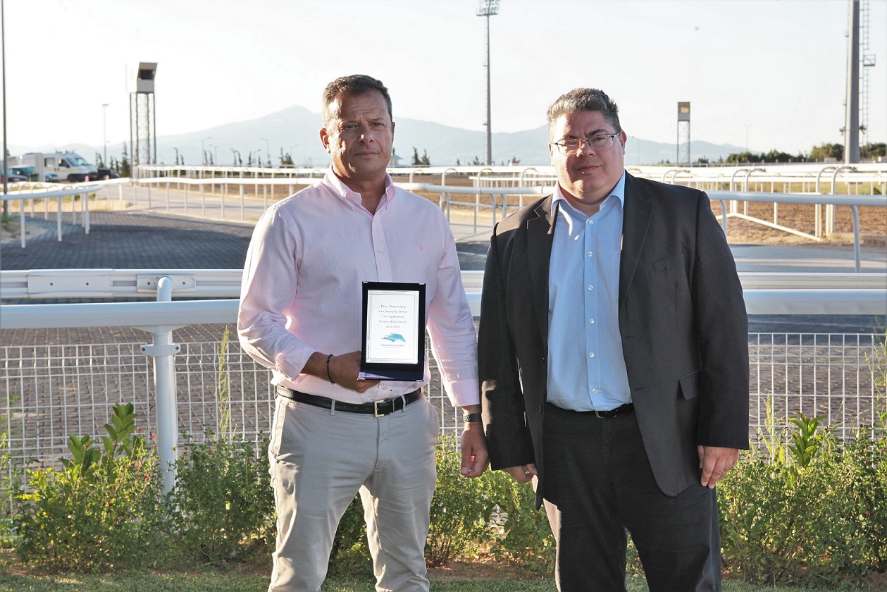 (O Chief Operation Officer της ΙΠΠΟΔΡΟΜΙΕΣ Α.Ε. Κωνσταντίνος Αλεξόπουλος απονέμει το Τρόπαιο Βάσος Βασιλείου στον Χρήστο Θεοδωράκη, εκπρόσωπο της ιδιοκτησίας του ίππου ΕΛΕΓΚΑΝΤΛΥ ΜΠΑΟΥΝΤ)