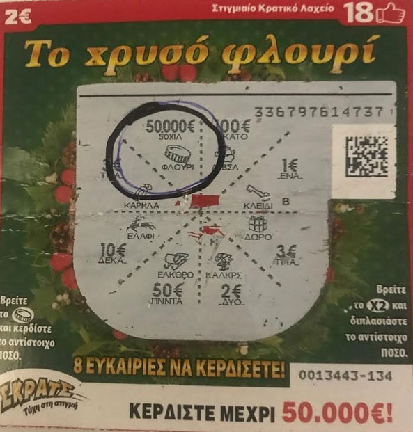 Ο Λαρισαίος τυχερός του ΣΚΡΑΤΣ δεν άντεξε τη συγκίνηση και λιποθύμησε όταν συνειδητοποίησε ότι το δελτίο «Ρόδι είναι και κερδίζει» που είχε αγοράσει από πρακτορείο της πόλης έκρυβε το μεγάλο ποσό. Ευτυχώς, η λιποθυμία του ήταν μόνο αποτέλεσμα του ενθουσιασμού του και ο τυχερός παίκτης αναμένεται να περάσει τα Χριστούγεννα της ζωής του με την οικογένειά του.