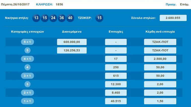 Νέο τζακ ποτ σημειώθηκε απόψε, Πέμπτη 26/10/2017 στην κλήρωση του Τζόκερ.