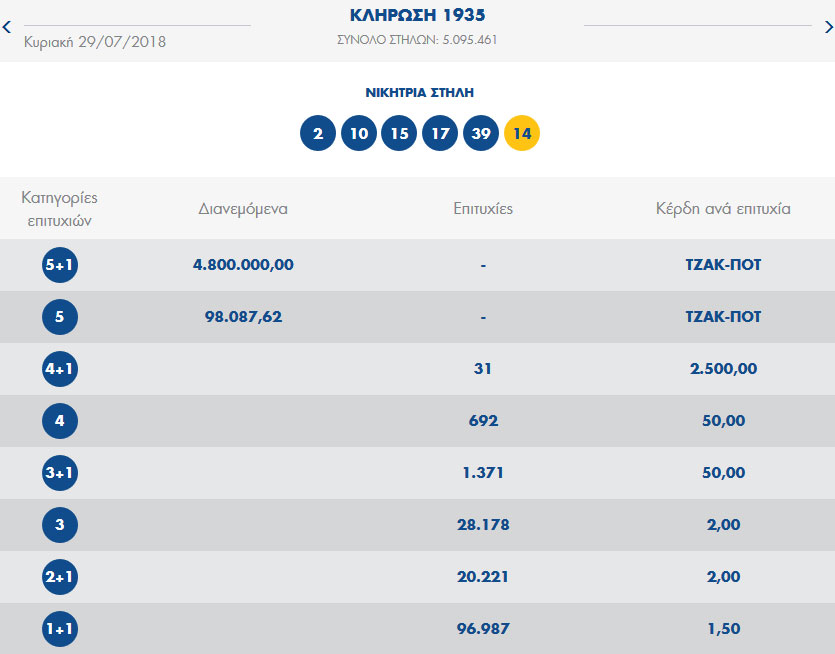 Οι τυχεροί αριθμοί που ανέδειξε η κλήρωση είναι οι εξής: 2, 10, 15, 17, 39