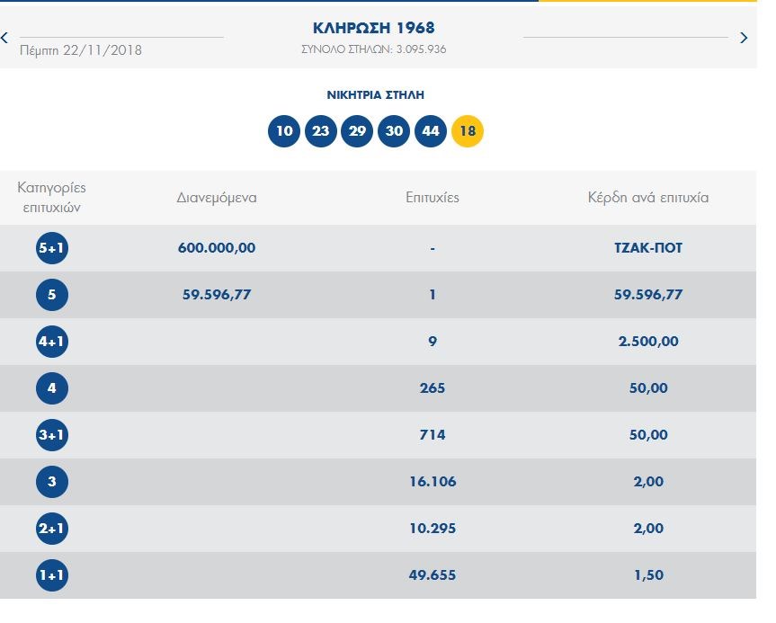 Τζακ ποτ σημειώθηκε κατά την κλήρωση του Τζόκερ της Πέμπτης οι τυχεροί αριθμοί και τα διανεμόμενα κέρδη είναι: