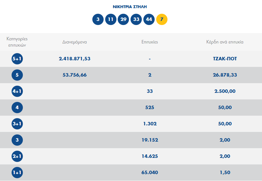 Οι αριθμοί που ανέδειξε η κληρωτίδα στην αποψινή κλήρωση είναι οι: 3, 11, 29, 33, 44, ενώ ο αριθμός τζόκερ ήταν το 7.