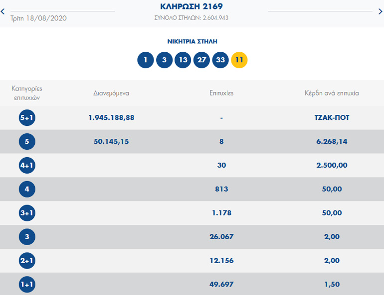 Χωρίς νικητή ολοκληρώθηκε η κλήρωση και η διαλογή του Τζόκερ την Τρίτη 18 Αυγούστου. Οι τυχεροί αριθμοί του: , 3, 13, 27, 33. ΤΖΟΚΕΡ: 11...