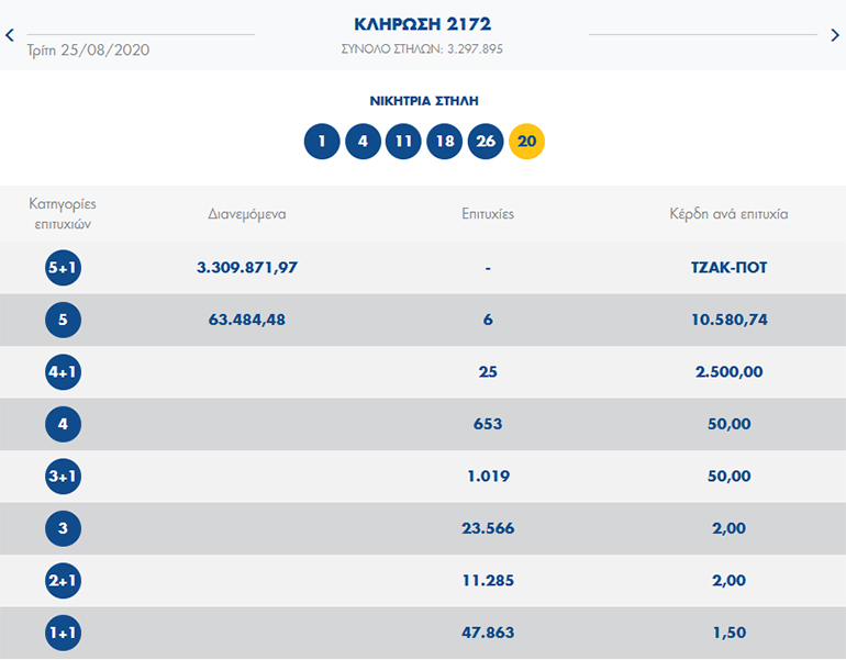 Χωρίς νικητή ολοκληρώθηκε η κλήρωση και η διαλογή του Τζόκερ την Πέμπτη 20 Αυγούστου. Οι τυχεροί αριθμοί του: 1, 4, 11, 18, 26. ΤΖΟΚΕΡ: 20...