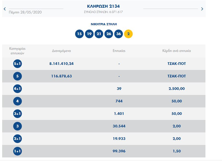 Οι αριθμοί που ανέδειξε η κληρωτίδα στην αποψινή κλήρωση είναι οι: 15, 19, 21, 26, 36 με τζόκερ τον αριθμό 2.