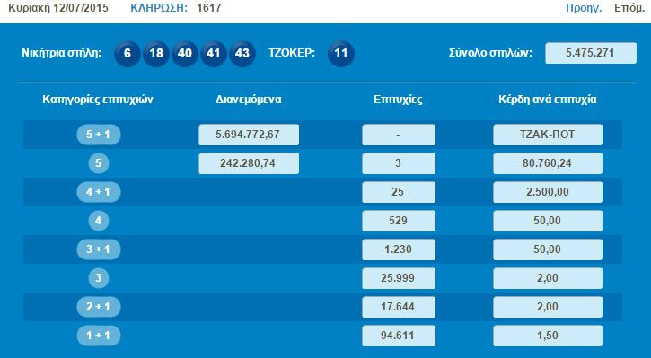 Ούτε στην κλήρωση της Κυριακής (12/7) αναδείχθηκε κάποιος υπερτυχερός στην πρώτη κατηγορία (5+1) του τζόκερ, με αποτέλεσμα να υπάρξει ακόμη ένα τζακ ποτ...