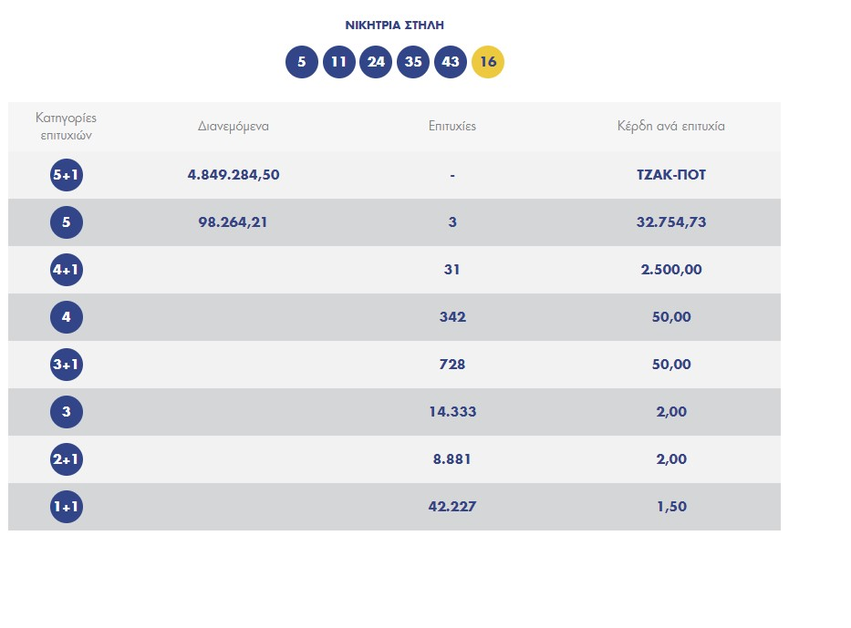 Οι αριθμοί που κληρώθηκαν είναι οι: 5, 11, 24, 35, 43 και Τζόκερ το 16.