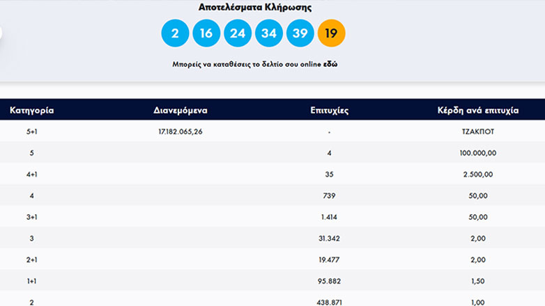 Οι τυχεροί αριθμοί στη σημερινή κλήρωση είναι οι εξής: 2, 16, 24, 34, 39 και τζόκερ το 19.