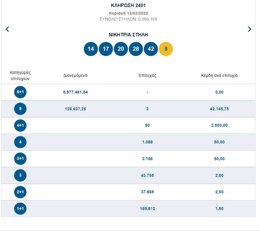 Οι τυχεροί αριθμοί: 14, 17, 20, 28, 42. ΤΖΟΚΕΡ: 8.