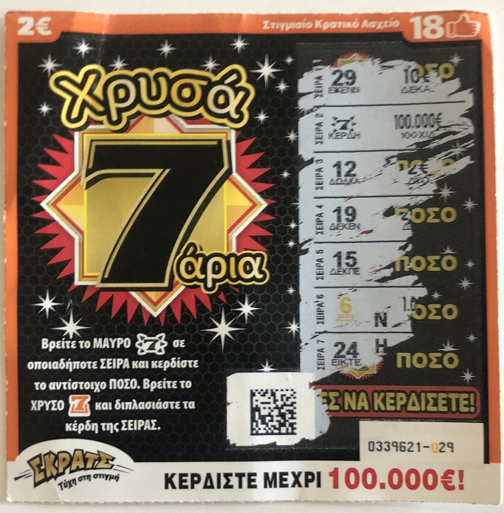 Το 7 είναι ο τυχερός του αριθμός και έτσι αγόρασε ένα δελτίο του παιχνιδιού «ΧΡΥΣΑ 7ΑΡΙΑ» από το παντοπωλείο της γειτονιάς του. Η επιλογή του παίκτη του ΣΚΡΑΤΣ, όπως αποδείχθηκε, ήταν όντως «χρυσή». Ο λαχνός είχε ένα μαύρο 7 δίπλα στις 100.000 ευρώ και έτσι το ποσό έγινε δικό του.