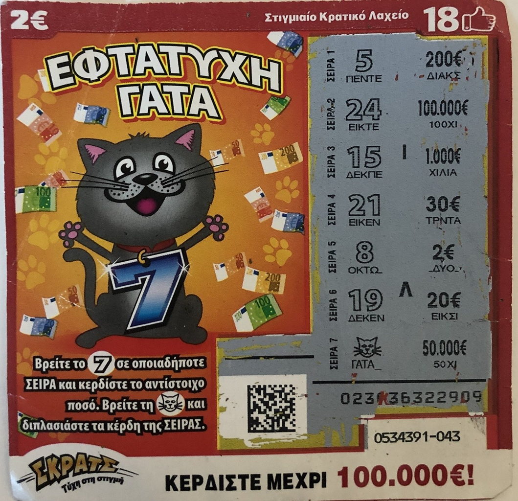 Το μεγάλο έπαθλο του παιχνιδιού «ΕΦΤΑΤΥΧΗ ΓΑΤΑ» κέρδισε ένας νικητής από την Αττική, σκρατσάροντας τον τυχερό λαχνό παρέα με φίλους του. Οι έξι φίλοι αγόρασαν όλοι μαζί μερικά δελτία ΣΚΡΑΤΣ, καθένας διάλεξε στην τύχη από ένα και εκείνος που επέλεξε την «ΕΦΤΑΤΥΧΗ ΓΑΤΑ» είδε να εμφανίζεται μπροστά του το σύμβολο της τυχερής γάτας που κέρδιζε 100.000 ευρώ. Ο τυχερός παίκτης θα δώσει ένα ποσό από τα κέρδη στους φίλους του και με τα υπόλοιπα χρήματα, όπως τους εκμυστηρεύτηκε, θα κάνει ταξίδια με τη μηχανή του, όταν το επιτρέψουν οι συνθήκες.