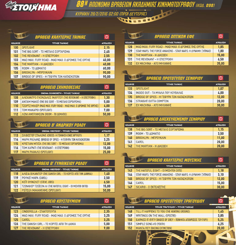 Το ΠΑΜΕ ΣΤΟΙΧΗΜΑ θα είναι και εφέτος ο μεγάλος πρωταγωνιστής των Oscar και προσφέρει 10 ειδικά στοιχήματα. Από σήμερα μέχρι και την Κυριακή το βράδυ στα πρακτορεία μπορείτε να δοκιμάσετε την τύχη σας και το κινηματογραφικό σας ένστικτο. Το δελτίο σας μπορείτε να το δημιουργήσετε και μέσω της εφαρμογής opapp.