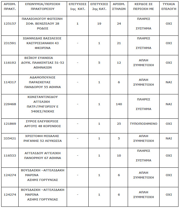Επίσης, τριάντα δύο επιτυχίες βρέθηκαν στην 2η κατηγορία (5) που κερδίζουν το ποσό των 4.682,79 ευρώ.