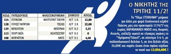 Ναι καλά διαβάζετε. Ο υπερτυχερός έπαιξε ένα σύστημα 3-4-5 με πολλαπλασιαστή 5 και είδε να επαληθεύονται τα τέσσερα από τα πέντε «ημίχρονα-τελικά» με το δελτίο του φυσικά να εκτοξεύεται.