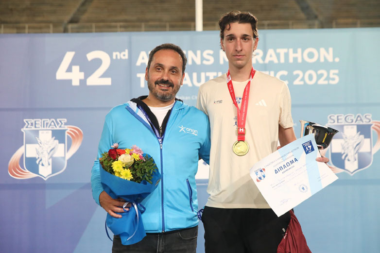 Ο Chief Customer Officer του ΟΠΑΠ, Lukas Antos, βραβεύει τη Σταματία Νούλα, νικήτρια του 42ου Αυθεντικού Μαραθωνίου της Αθήνας και του Πανελλήνιου Πρωταθλήματος Μαραθώνιου δρόμου