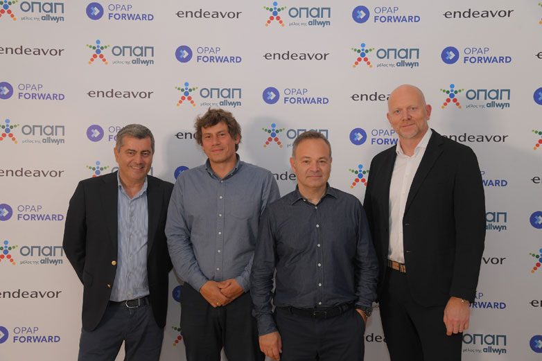 Ο Οδυσσέας Χριστοφόρου, Αναπληρωτής Διευθύνων Σύμβουλος ΟΠΑΠ, ο Παναγιώτης Καραμπίνης, Managing Director της Endeavor Greece, ο Μάρκος Βερέμης, Partner της Big Pi Ventures και Μέλος του Δ.Σ. της Endeavor Greece και ο Jan Karas, Πρόεδρος και Διευθύνων Σύμβουλος ΟΠΑΠ