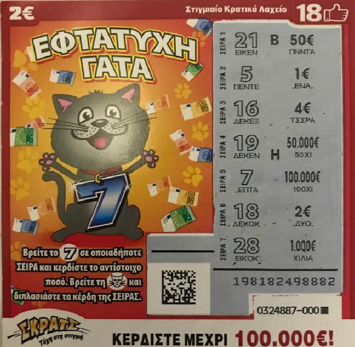 Την τυχερή ημέρα επισκέφτηκε το πρακτορείο της γειτονιάς του και επέλεξε ένα δελτίο «Εφτάτυχη Γάτα» των 2 ευρώ, το οποίο άρχισε να ξύνει επιτόπου. Όταν είδε τον τυχερό αριθμό «7» και δίπλα να εμφανίζονται σιγά-σιγά πολλά μηδενικά, τον πλημμύρισε μία τόσο έντονη συγκίνηση που σταμάτησε αμέσως το «σκρατσάρισμα» και έδωσε στον πράκτορα το ημιτελώς ξυσμένο δελτίο για να συνεχίσει. Ο πράκτορας με τη σειρά του επιβεβαίωσε ότι το δελτίο κέρδιζε το μεγάλο έπαθλο των 100.000 ευρώ και, έτσι, ο μεγάλος νικητής πίστεψε ότι η τύχη του είχε χαμογελάσει για τα καλά!