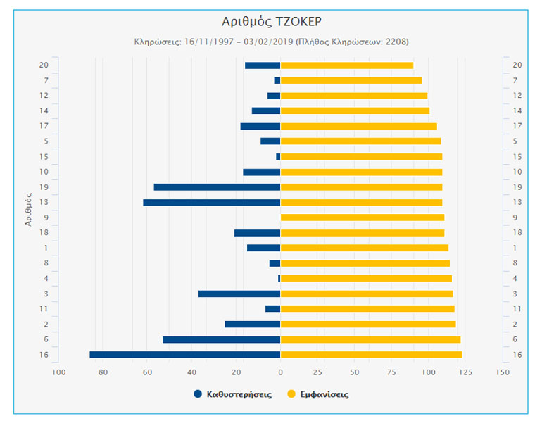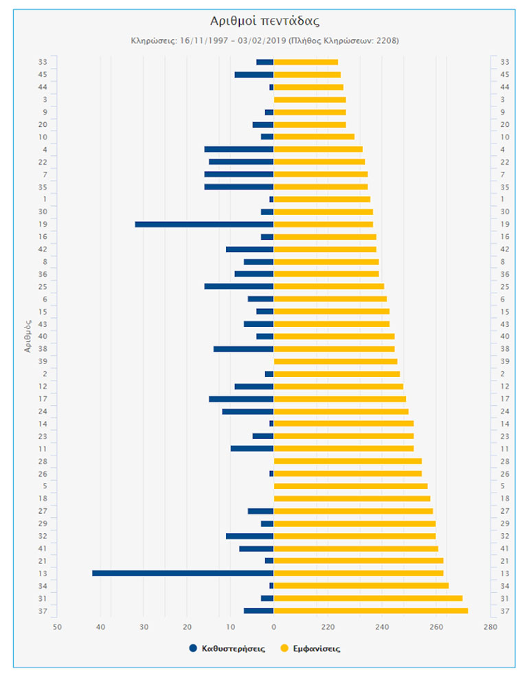 Παρόλα αυτά οι πιο «άτυχοι» αριθμοί με τις λιγότερες εμφανίσεις στην ιστορία του παιχνιδιού είναι οι 33, 45, 44, 3 και 9 για την πεντάδα και οι 20, 7, 12, 14 και 17 για τους αριθμούς ΤΖΟΚΕΡ.