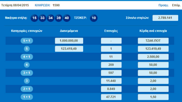 Την ίδια στιγμή, ένας υπερτυχερός μάντεψε σωστά τους 5 αριθμούς που ανέδειξε η κληρωτίδα, με αποτέλεσμα να γίνει πλουσιότερος κατά 123.419 ευρώ.