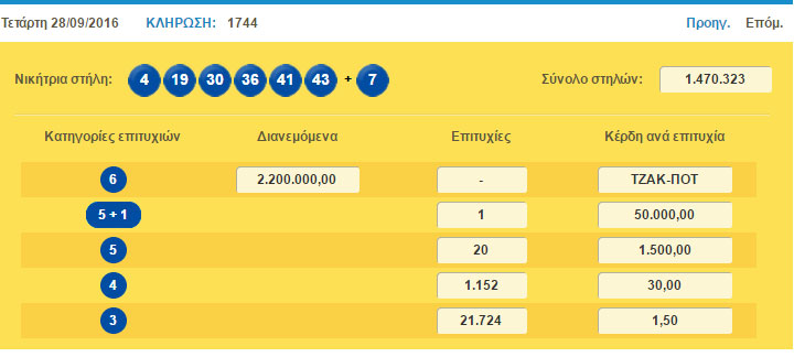 Χωρίς νικητή ολοκληρώθηκε η κλήρωση και η διαλογή του ΛΟΤΤΟ. Οι τυχεροί αριθμοί του ΛΟΤΤΟ: 4, 19, 30, 36, 41, 43. Bonus: 7.