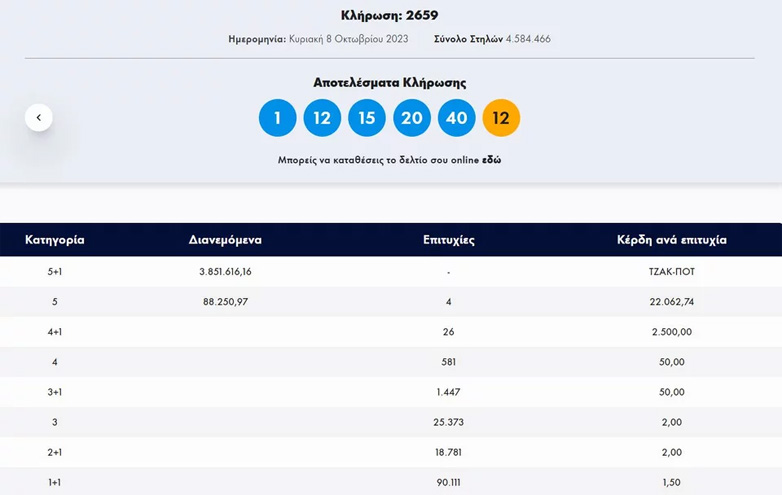 Οι τυχεροί αριθμοί στη σημερινή κλήρωση είναι οι εξής: 1, 12, 15, 20, 40 και τζόκερ ο αριθμός: 12.