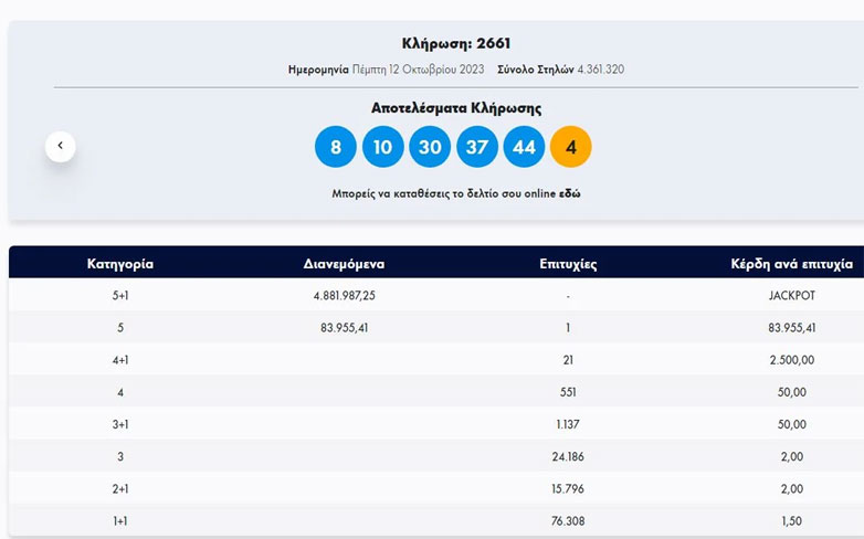Στη δεύτερη κατηγορία βρέθηκε 1 δελτίο που κερδίζει 83.955,41 ευρώ.