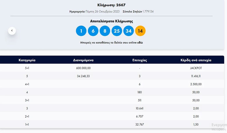 Στη δεύτερη κατηγορία βρέθηκαν 3 δελτία που κερδίζουν από 11.416,11 ευρώ.