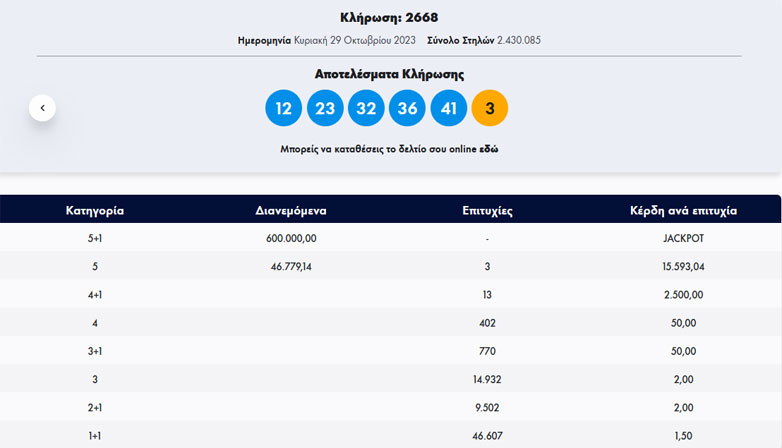 Στη δεύτερη κατηγορία βρέθηκαν 3 δελτία που κερδίζουν από 15.593,04 ευρώ.