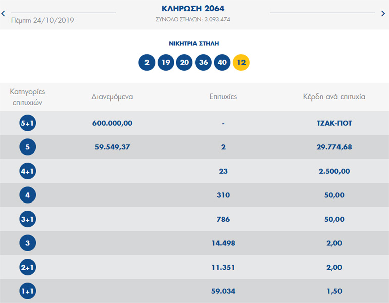 Χωρίς νικητή στην κύρια κατηγορία ολοκληρώθηκε η κλήρωση και η διαλογή στο Τζόκερ. Οι τυχεροί αριθμοί είναι οι: 2, 19, 20, 36, 40. Τζόκερ: 12...