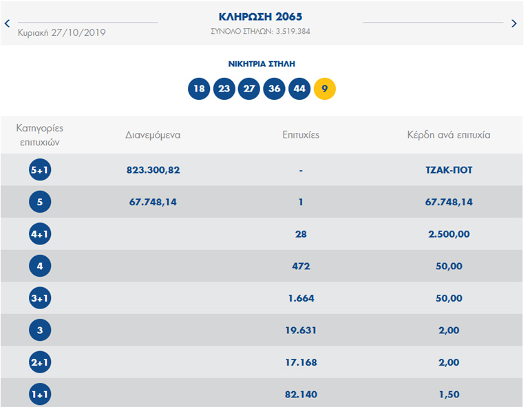 Χωρίς νικητή στην πρώτη κατηγορία ολοκληρώθηκε η κλήρωση και η διαλογή του Τζόκερ. Οι τυχεροί αριθμοί είναι οι 18, 23, 27, 36, 44. Τζόκερ: 9.