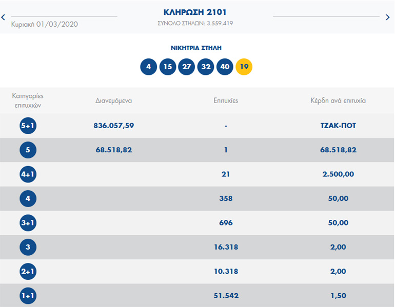 Χωρίς νικητή στην πρώτη κατηγορία ολοκληρώθηκε η κλήρωση και η διαλογή στο Τζόκερ. Αντίθετα, ένα νικητής στην δεύτερη κατηγορία πήρε το ποσό των 68.500 ευρώ...
