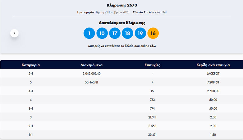 Στη δεύτερη κατηγορία βρέθηκαν 7 δελτία που κερδίζουν από 7.208,68 ευρώ...