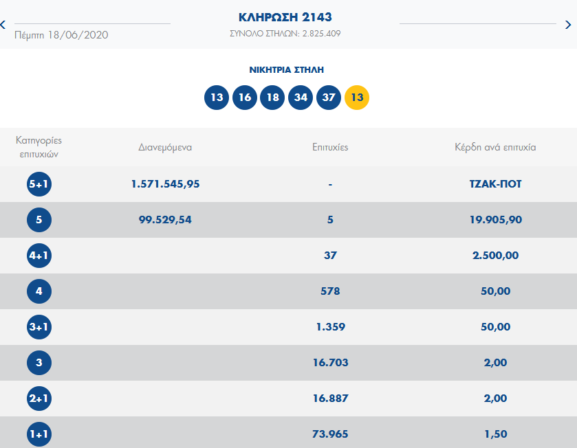 Οι αριθμοί που ανέδειξε η κληρωτίδα στην αποψινή κλήρωση είναι οι: 13, 16, 18, 34, 37, ενώ ο αριθμός τζόκερ ήταν το 13.