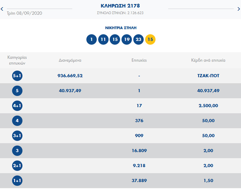 Χωρίς νικητή ολοκληρώθηκε η κλήρωση και η διαλογή του Τζόκερ την Τρίτη 8 Σεπτεμβρίου. Οι τυχεροί αριθμοί του: 1, 11, 15, 19, 23. ΤΖΟΚΕΡ: 15...