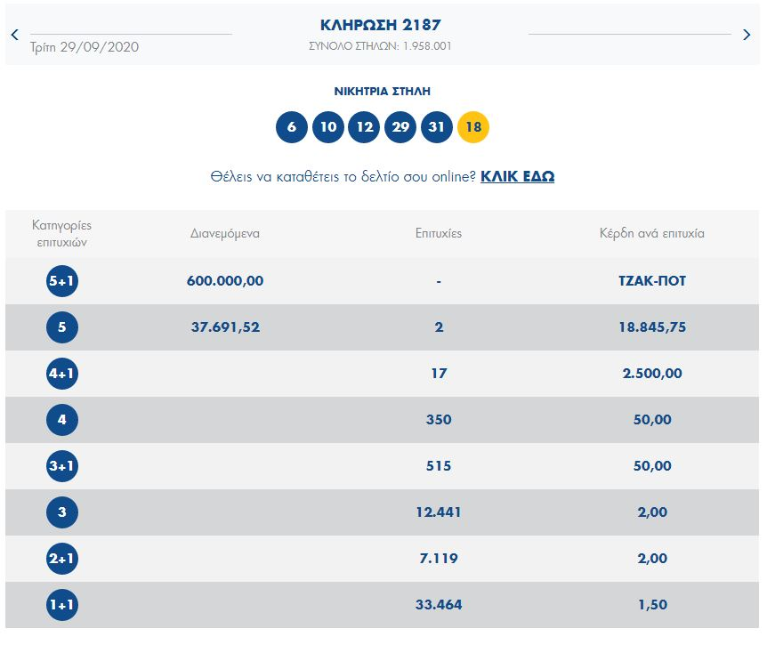 Χωρίς νικητή ολοκληρώθηκε η κλήρωση και η διαλογή του Τζόκερ την Τρίτη 29 Σεπτεμβρίου...