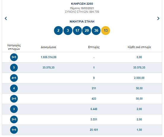 Χωρίς νικητή στην πρώτη κατηγορία ολοκληρώθηκε η κλήρωση και η διαλογή του Τζόκερ την Πέμπτη 18 Μαρτίου. Αντίθετα, στη δεύτερη κατηγορία ένα τυχερό δελτίο παίρνει 35.578 ευρώ. Οι τυχεροί αριθμοί: 2, 3, 17, 29, 36. ΤΖΟΚΕΡ: 13.