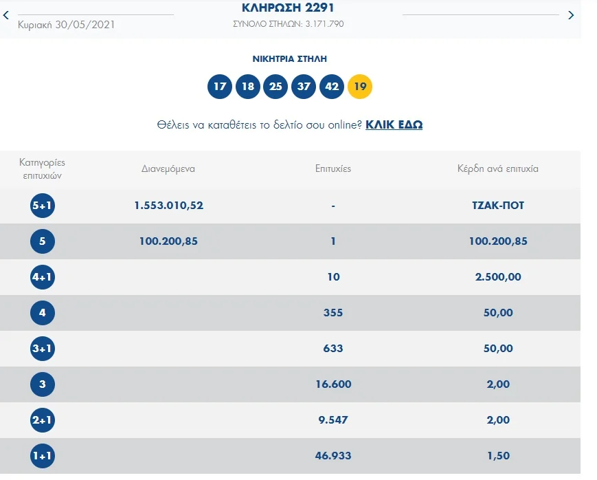 Οι τυχεροί αριθμοί: 17, 18, 25, 37, 42. ΤΖΟΚΕΡ: 19.