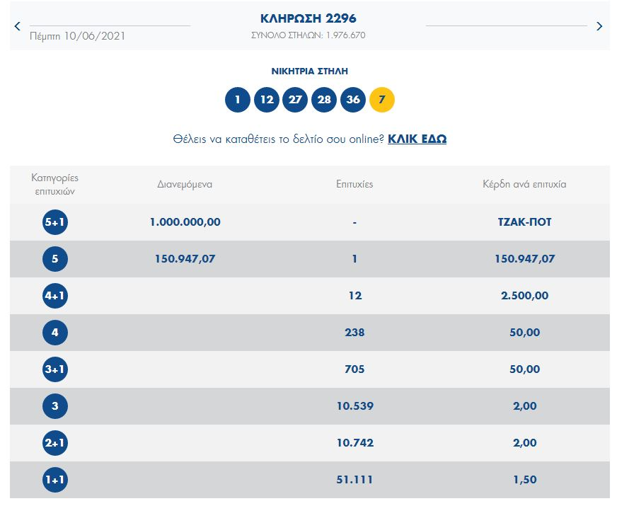 Χωρίς νικητή στην πρώτη κατηγορία ολοκληρώθηκε η κλήρωση και η διαλογή στο Τζόκερ. Αντίθετα, στη δεύτερη κατηγορία βρέθηκε...