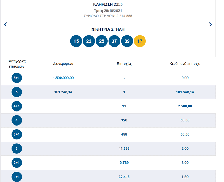 Οι τυχεροί αριθμοί: 15, 22, 25, 37, 39. ΤΖΟΚΕΡ: 17.