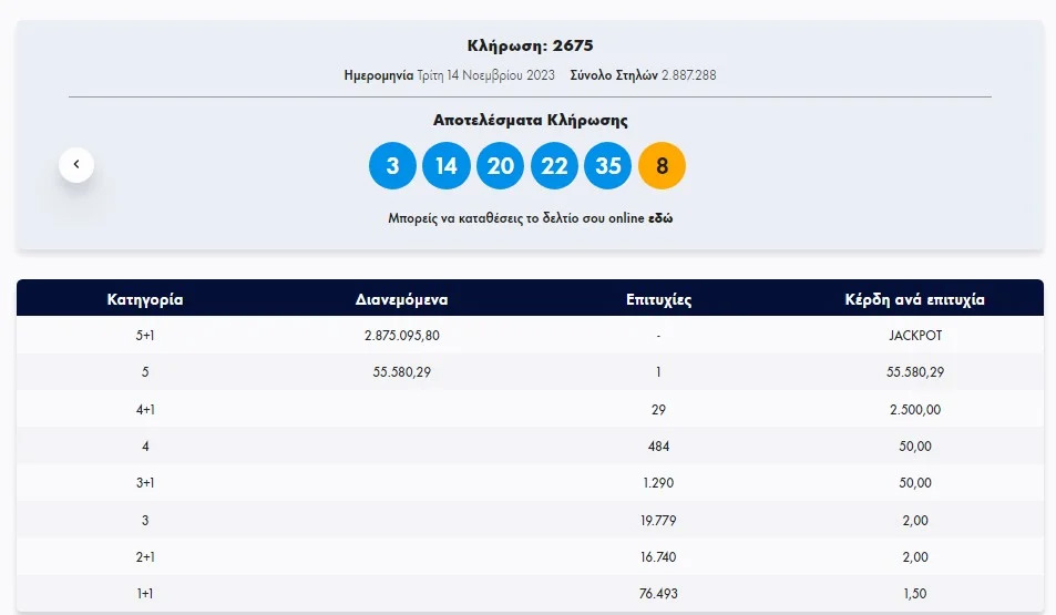 Οι τυχεροί αριθμοί στη σημερινή κλήρωση είναι οι εξής: 3, 14, 20, 22, 35 και τζόκερ ο αριθμός: 8.