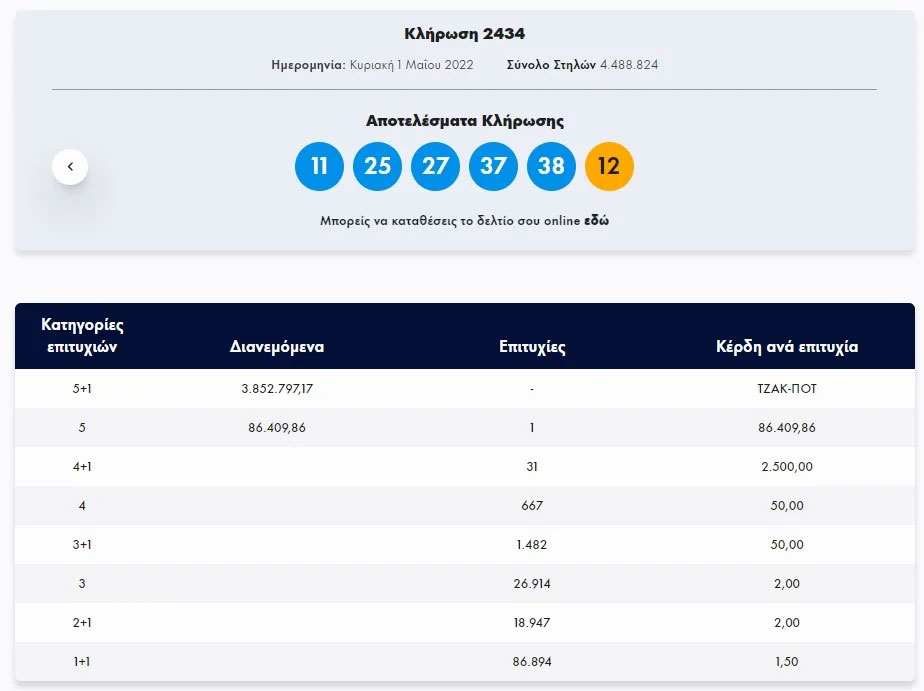Αξίζει να σημειωθεί ότι στην δεύτερη κατηγορία της αποψινής κλήρωσης βρέθηκε ένα δελτίο που κερδίζει 86.409,86 ευρώ.