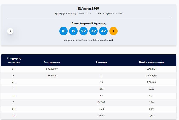 Χωρίς νικητή στην πρώτη κατηγορία ολοκληρώθηκε η κλήρωση και η διαλογή στο Τζόκερ. Αντίθετα, στη δεύτερη κατηγορία βρέθηκαν δύο δελτία που κερδίζουν...
