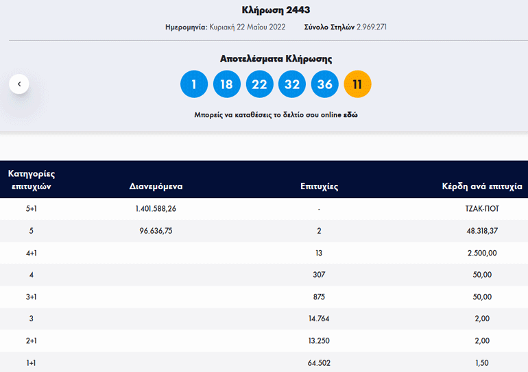 Οι τυχεροί αριθμοί: 1, 18, 22, 32, 36. ΤΖΟΚΕΡ: 11.