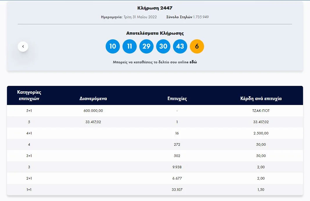 Οι τυχεροί αριθμοί: 10, 11, 29, 30, 43. ΤΖΟΚΕΡ: 6.